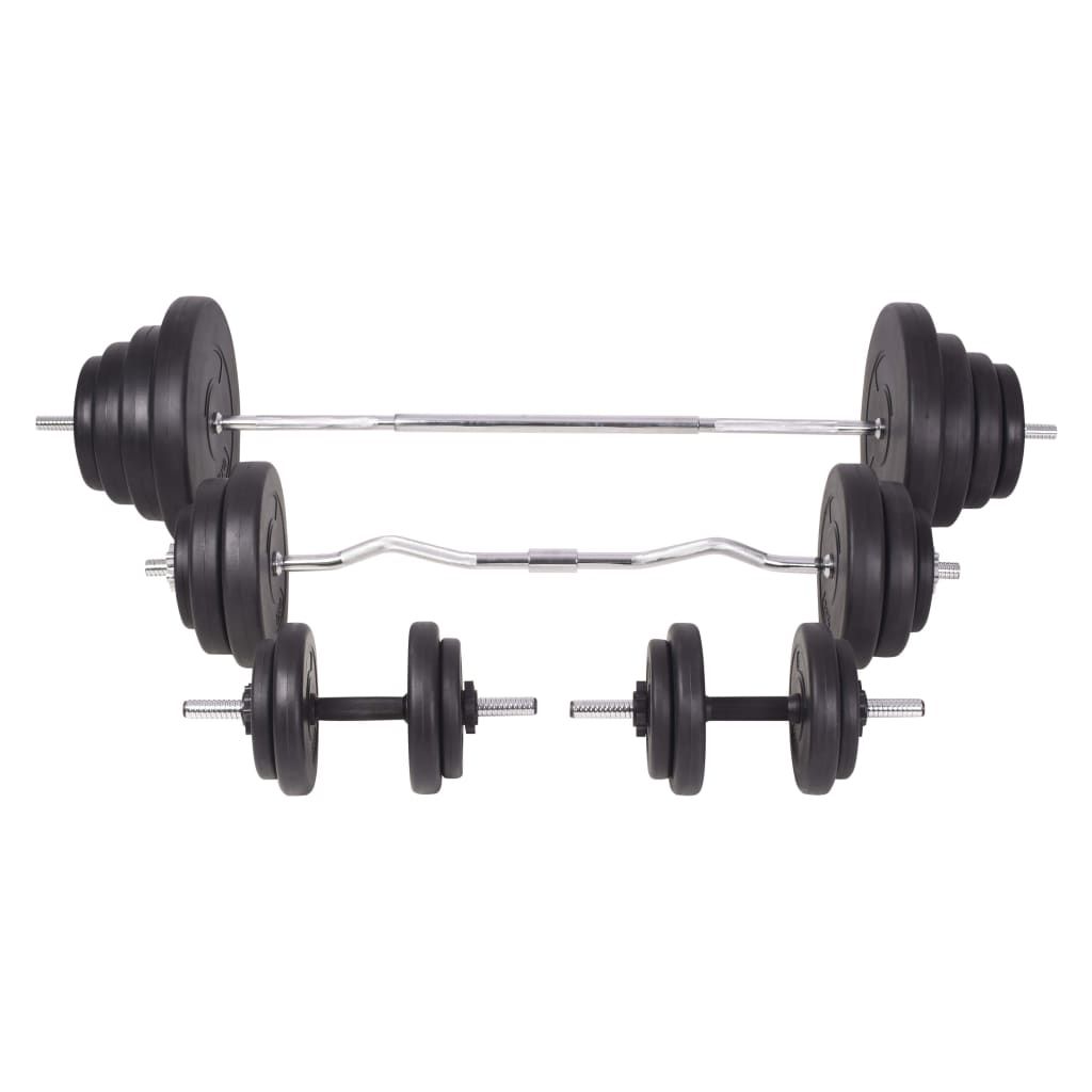 This versatile barbell and dumbbell set is perfect for chest, biceps, arms, triceps and back muscles. It includes two 33.1 lb plates, two 22 lb plates, two 16.5 lb plates, four 11 lb plates, six 5.5 lb plates, six 2.8 lb plates, two barbell bar and two dumbbell bar and has a total weight of about 264.6 lb.