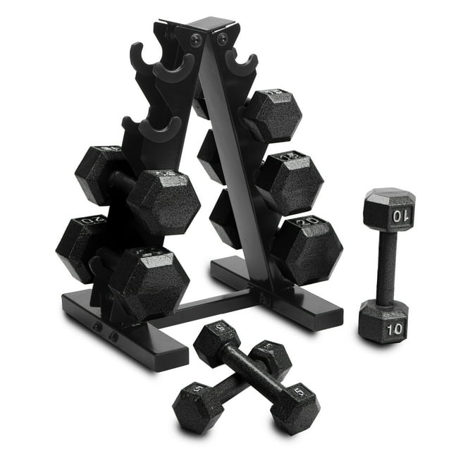 Includes 5 pairs of hex dumbbells: 10 lb, 15 lb, 20 lb, 25 lb, and 30 lb (2 of each weight).