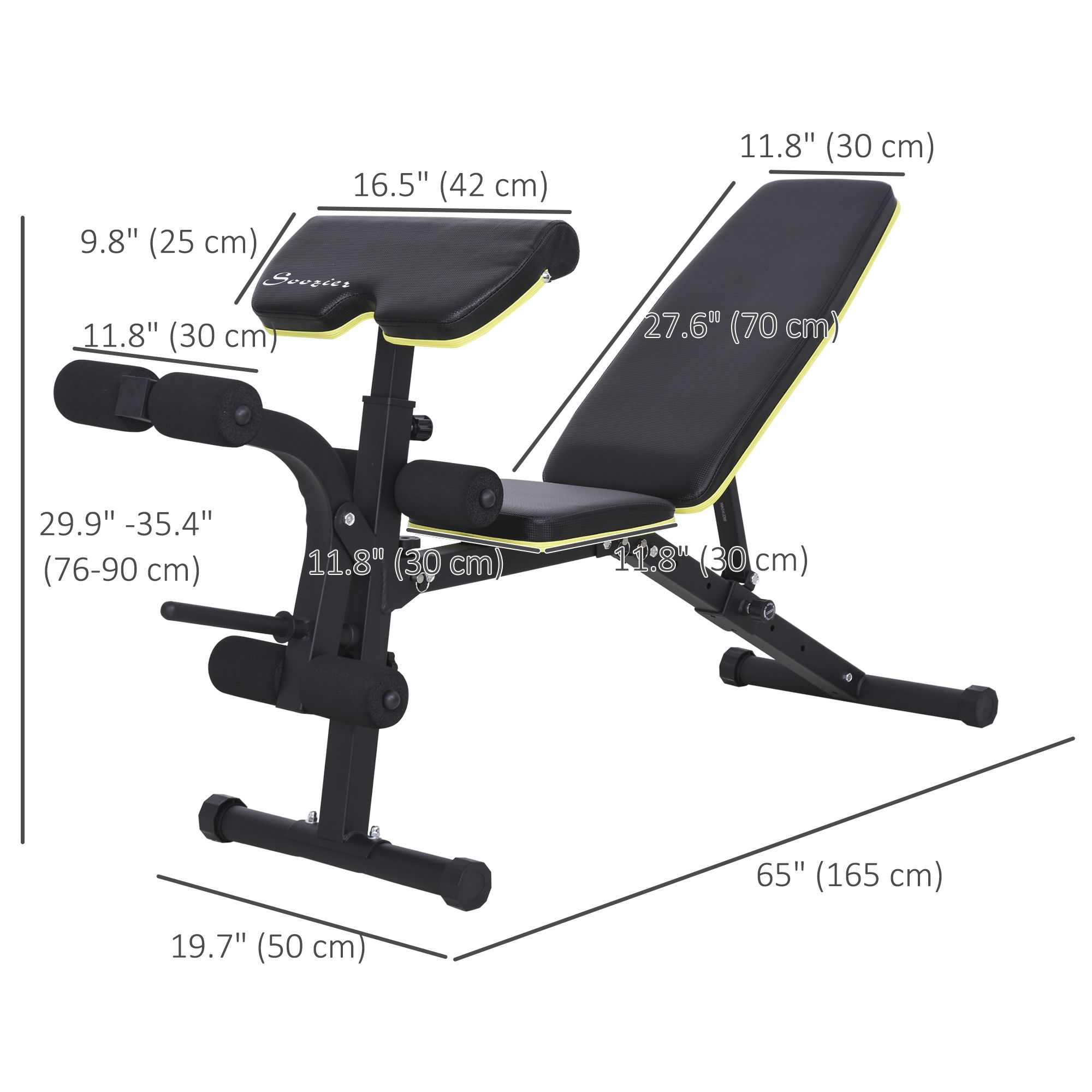 • Fitness Bench Dimensions: Overall Dimension: 19.75"L x 65"W x 30"-35.5"H. Seat Cushion Size: 11.75"W x 11.75"D x 1.75"T. Back Size: 11.75"L x 27.5"W x 1.75"H.