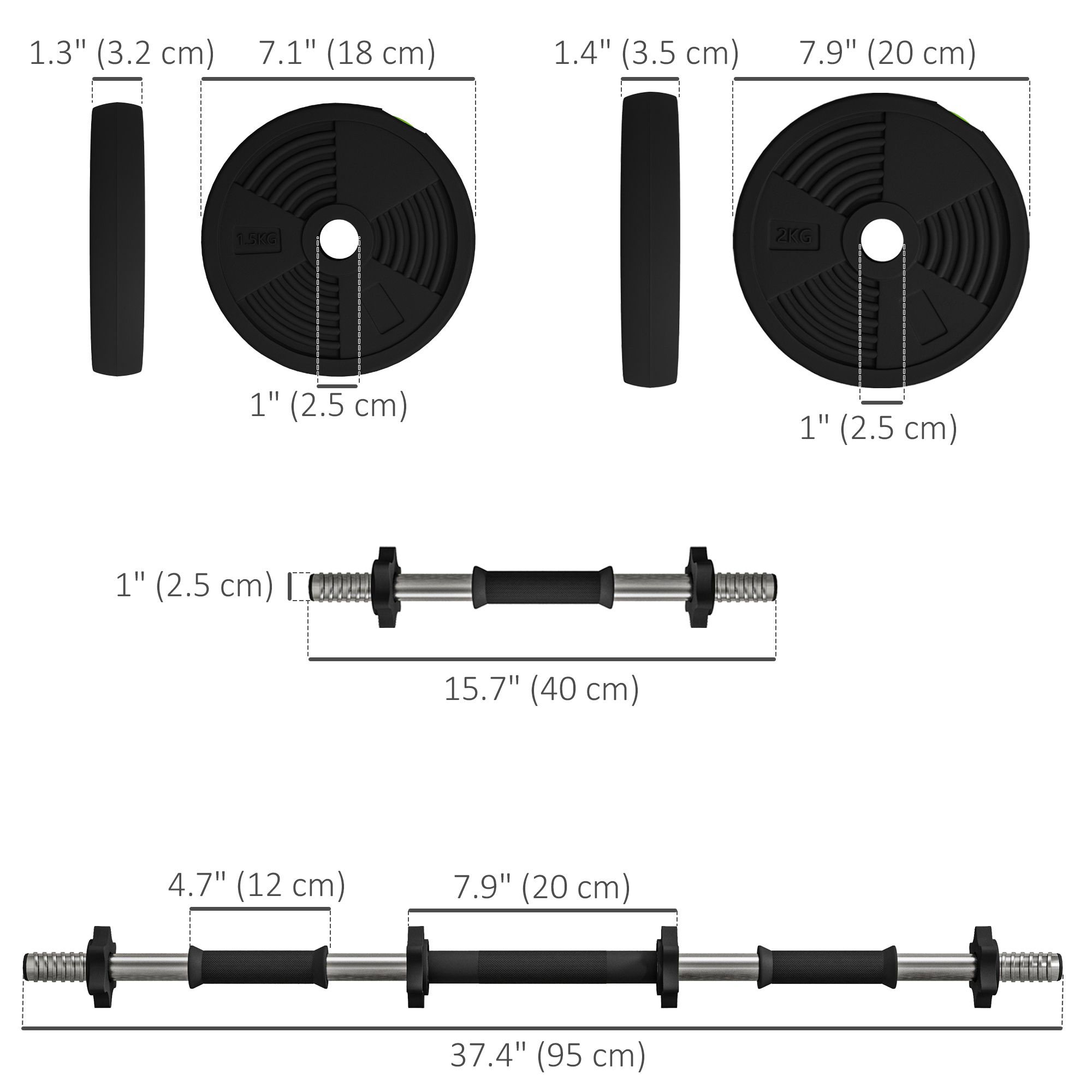 • 33 lbs (15 kg) Weight Set: 4 x 4.4lbs (4 x 2kg) and 4 x 3.3 lbs (4 x 1.5kg) weights. 2 x 1.1lbs (2 x 0.5kg) dumbbell handles.